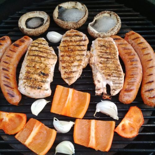 - Apply some Cajun seasoning or a spicy rub to the breasts and grill them along with the sausages until cooked to perfection, adding the onion, pepper, and garlic part-way through.