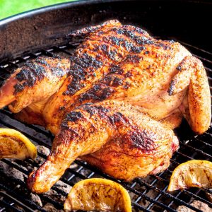 - Grill chicken at 375, bone side down for 45-60 minutes depending on size of chicken. Do not turn over. Squeeze lemon all over crispy skin and serve on a platter.