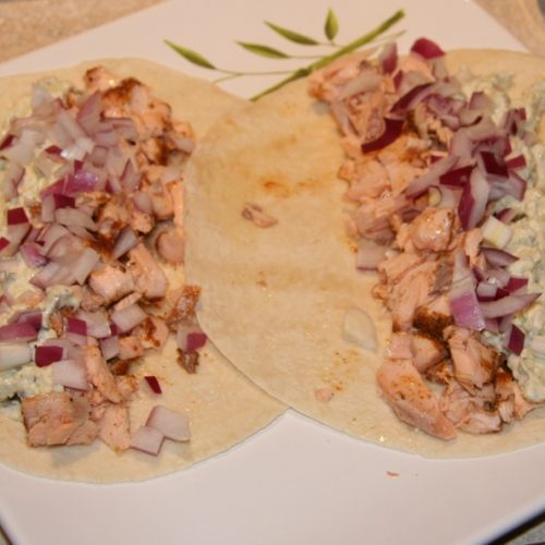 - Grill salmon over a medium high heat until done. Break or chop salmon into small pieces and distribute among warmed tortillas. Top with avocado dressing, diced tomatoes, and red onion.