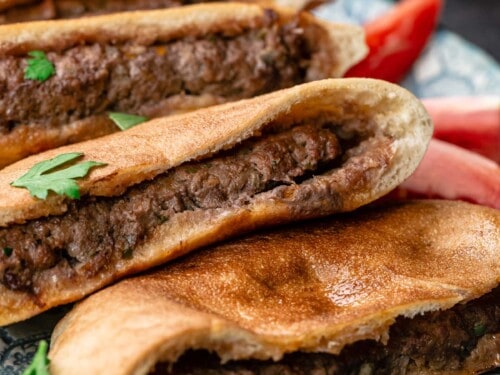 - Fill the pitas (slice, make a pocket), brush with olive oil