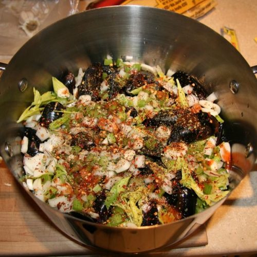 - Clean and rinse mussels sorting out the undesirables, and place in large pot. Pour in bottle of beer, add remaining ingredients. Swirl pot around a little to mix things up.