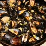 - Add sherry and Muscles stir reduce heat to medium/low (we want steam) and cover for 5 minutes.