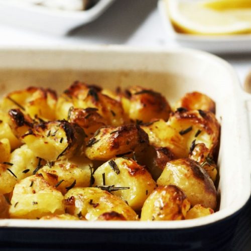 - Lay potatoes out in a 9×13 pan, and roast for about an hour.