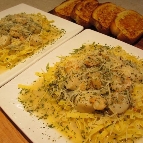 - Heat oil over medium high heat then add garlic and onions, stirring for one minute. Add shrimp and scallops, stirring for two minutes.