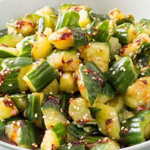 - Lay Cucumbers on flat surface, cut side down. Press down on the flat of your blade, using your hand, to break/smash the pieces into bite-sized.