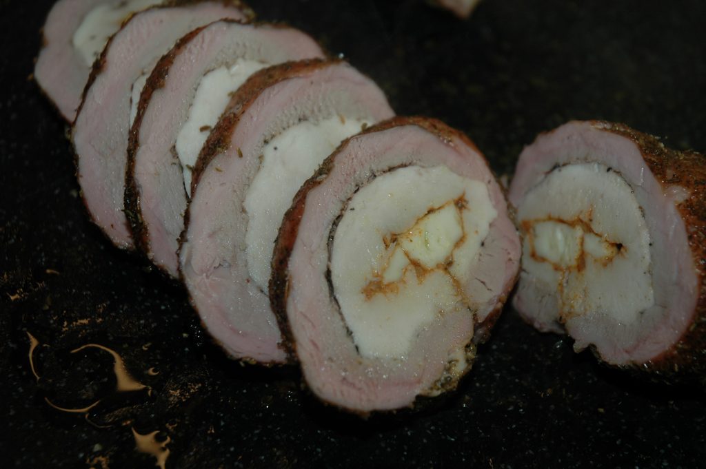 Cheese curds, stuffed into chicken breast, wrapped in pork tenderloin.