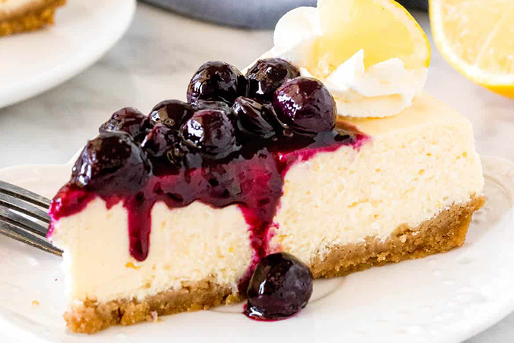 A decadent lemon cheesecake with a warm blueberry compote topping