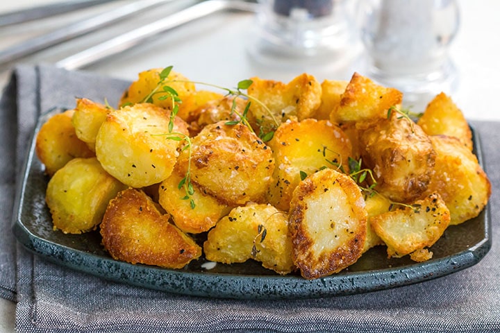 Save time by par-boiling your spuds. Semolina gives it that extra crunch!