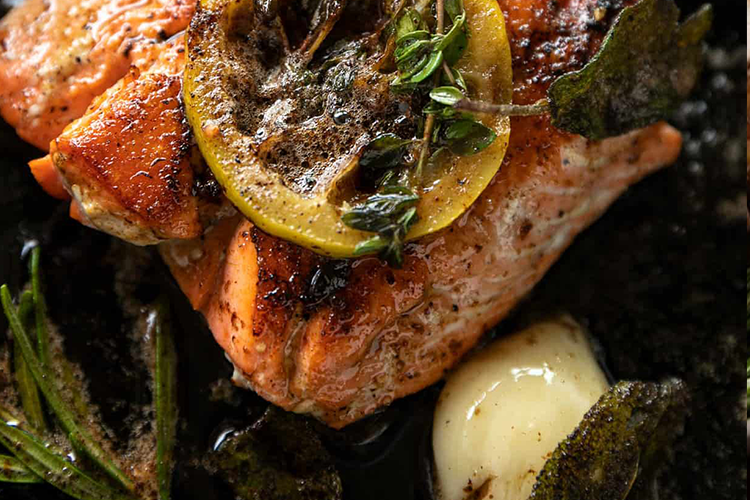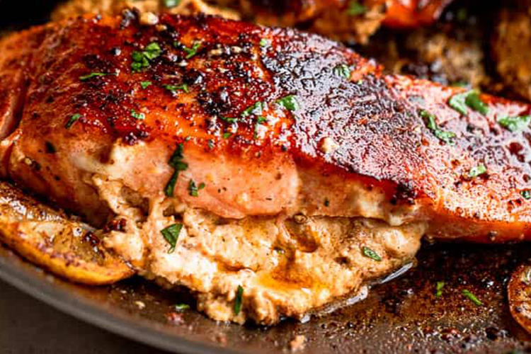 Savoury stuffing inside a salmon, baked to perfection. The taste of apple goes so well with salmon