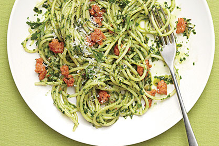 A unique take on spaghetti, using pesto and sausage balls. Very herby and savouriy!