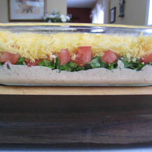 On top of that base, layer on the green onions, lettuce, tomatoes and top with finely shredded cheese.