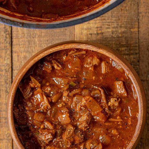 In Dutch oven, heat half of the oil over medium-high heat; brown beef, in batches and adding remaining oil as needed.