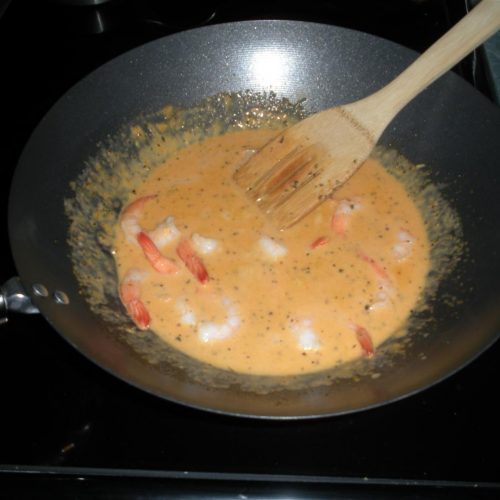 Add the shrimp, basil leaves, and sugar, and cook until the shrimp turn pink.