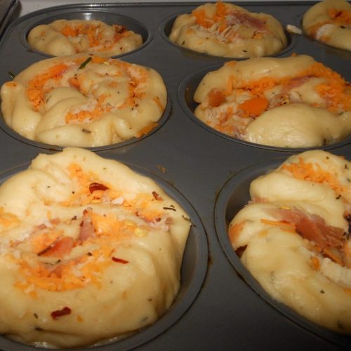 Cut into 1 inch thick pinwheels. Place each wheel into a greased muffin pan or pan.