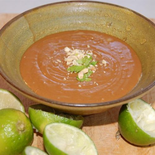 In a bowl, mix the peanut butter, coconut milk, water, lime juice, soy sauce, fish sauce, hot sauce, ginger, and garlic.