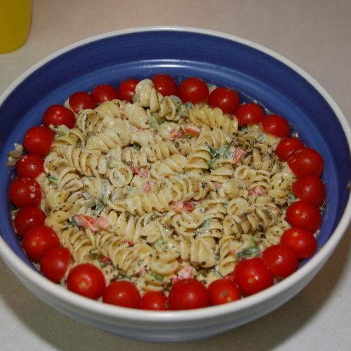 Val the Impaler is notorious for NOT sharing recipes, and making things on the fly, and even making things up as she goes along. The recipe shown above is an approximation of one of her pasta salads, so feel free to play around with amounts and ingredients to suit your taste and/or needs. Can be garnished with tiny tim tomatoes, thinly sliced hard boiled eggs, assorted greenery, etc.