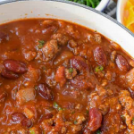 - Mix in the diced tomatoes with juice, dark beer, coffee, tomato paste and beef broth. Season with brown sugar, chili powder, cumin, cocoa powder, oregano, cayenne pepper, coriander and salt. Stir in 2 cans of the beans and hot chile peppers. Reduce heat to low, and simmer for 1 1/2 hours.